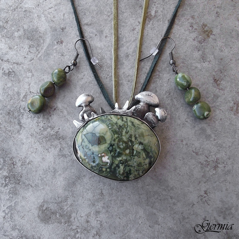 Author jewel with three edible wild mushrooms in the grass, green exquisite painted ryolite, ryolite earrings as a gift., two green leather laces.